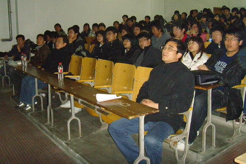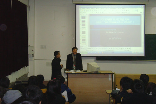在国际学院王丽芳老师的协助下,中外合作办学建筑学06本一的孙铭同学做了现场口译。金钟根博士借助多媒体图片,结合德国历史的发展及空间分布图,给学生们讲述了波茨坦广场的位置及在德国所起的重要作用,并结合专业分析了波茨坦广场的设计开发。讲座结束后,许多同学仍意犹未尽,继续和金钟根博士探讨设计方面的问题。