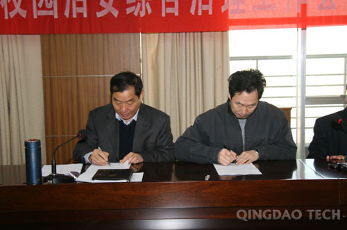 会上,耿喜华书记与各单位各部门签订了2010年度校园治安综合治理暨平安校园建设工作承诺责任书;保卫处处长王国庆传达了省委高校工委高校安全稳定工作会议精神和教育部、公安部《高校消防安全管理规定》,对2009年校园综合治理工作进行了总结,并对2010年校园综合治理工作作了部署。