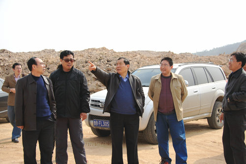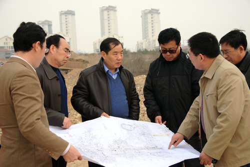 在紧张忙碌的施工现场,耿书记听取了新校区指挥部和设计院、监理公司负责人关于新校区校门和图书馆两侧绿化准备工作的汇报。