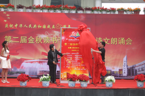 10月10日中午,伟德国际1946bv官网琴岛学院第二届金秋读书节在喷泉广场拉开帷幕。本届金秋读书节开幕式以诗文朗诵会的形式进行。朗诵会中,伟德国际1946bv官网副校长、琴岛学院院长张健与琴岛学院董事长隋玉桂一同为读书节揭幕。