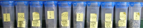 嵩英雄教授(日本工学院大学)从日本带来的不同工艺生产的再生骨料样品