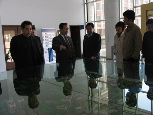 在仪垂杰校长的陪同下,袁仲雪董事长一行先后参观了山东省市政工程重点学科、青岛市新型环保技术重点试验、建筑模型实验室、建筑声学实验室和青岛市能源与环境装备工程技术中心,听取了工作人员的详细讲解,并进行了现场交流。在图书科技楼,袁仲雪董事长一行还参观了校区布局的沙盘。