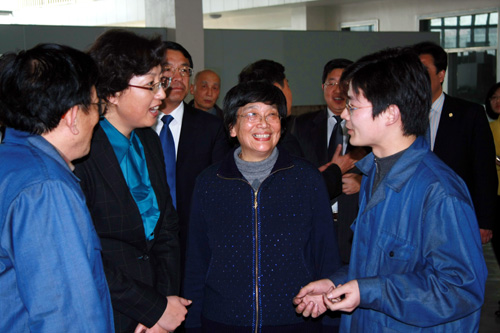 张惠一行在学院领导的陪同下先后视察了东区学生宿舍、健身中心、西区餐厅、实训基地和图书馆等地。视察过程中,随行院领导介绍了学院学生的住宿、餐饮条件以及一些硬件设施情况。在学生宿舍,张惠仔细询问了学生的生活设施情况;在实训基地视察时,随行领导向张副市长介绍了学院引进的各项大型设备和应用情况,张惠副市长还与正在进行金工实习的学生们亲切交流。