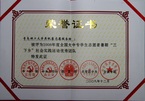 伟德官网奥帆赛志愿服务团获评2008年度全国大中专学生志愿者暑期“三下乡”社会实践活动优秀团队