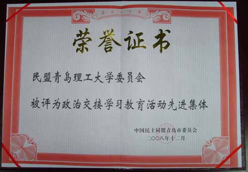 在2008年民盟青岛市盟务工作会议上,民盟伟德国际1946bv官网委员会被评为政治交接学习教育活动先进集体;民盟伟德国际1946bv官网常务副主委周汝萍被评为政治交接学习教育活动先进个人。