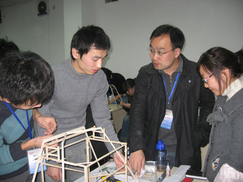 本次邀请赛要求参赛选手用不同规格的木条制作出具有一定空间尺寸的结构模型,承受竖向及水平荷载,以模型自重轻、计算精确、加工精细等因素为评判依据。伟德官网自接到参赛邀请后,得到了各级领导的关心与支持,土木工程学院及时购置比赛材料和设备进行了队伍选拔,并选派具有丰富经验的专业教师进行指导,学院领导临行前专程为参赛队伍送行。比赛期间,土木工程学院党总支副书记宋玲就伟德官网大学生科技创新工作与其他学校进行了交流,土木工程学院副院长王燕教授代表学校从本届比赛组织者河海大学接过了象征主办方的锦旗,伟德官网将于2009年举办第六届华东地区结构设计大赛。