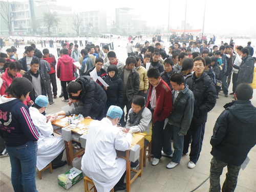 这次无偿献血活动由费县校区青年志愿者协会倡议,以“您的热血,我的生命”、“手拉手,肩并肩,让我们一起筑起生命的长城万里”为宣传口号,为了一个共同的信念,费县校区师生踊跃自愿参与,全天共有217人无偿献血,献血量达到一辆献血车一天采血量的上限。(费县校区)