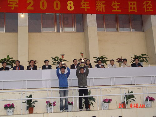 校党委副书记刘龙海宣布2008年新生田径运动会开幕,副校长李东对运动会的胜利召开表示热烈的祝贺,并预祝运动会取得圆满成功。裁判员代表宣誓,表示要做到“公平、公开、公正”执裁,保证运动会顺利进行。最后,运动员代表庄严宣誓,表示要顽强拚搏,自觉遵守比赛规则。