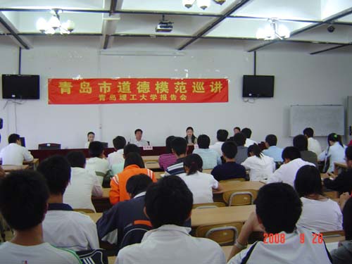 9月25日下午,青岛市道德模范巡讲在伟德官网举行,出席此次巡讲的有全国五一劳动奖章获得者、2007年感动山东十大人物获得者、2006、2007年感动青岛十佳人物获得者等模范代表,机械学院06、07级学生参加了报告会。