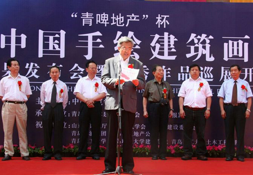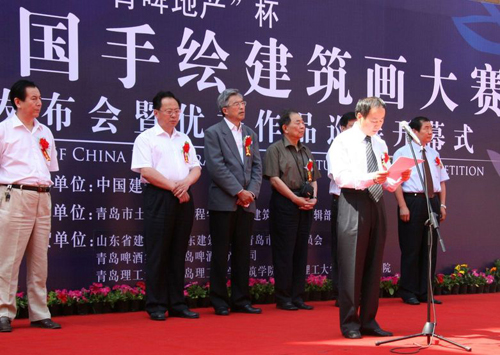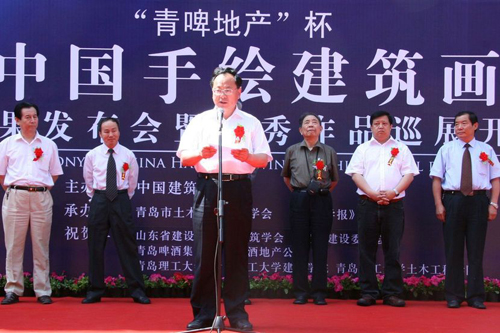 发布会上,周畅首先对大赛情况作了简要介绍并宣布比赛结果。青岛市副市长胡少军为开幕式致辞,胡副市长代表青岛市人民政府对大赛的成功举办表示热烈祝贺。他指出,青岛奥帆基地的落成已成为青岛城市建设的一个重要标志,青岛市土木建筑工程学会组织举办的本次比赛,将对青岛的城市建设起到进一步的推动作用,也给青岛建筑师提供了一个难得而宝贵的学习机会。随后,宋春华理事长致辞,对本次大赛做了总体评价,指出大赛的成功举办有着深远的意义,业界人士都能积极参与进来,大赛总体水平很高,达到了预期目的。同时,他指出,在当今计算机技术广泛应用的信息时代,建筑领域普遍采用电脑制图。但电脑制图方式存在样式单调、缺乏多样性的弊端,而手绘制图通过最直接、最真切的手脑联动方式,可以将设计灵感和方案灵活快速定格,从而使建筑画表现呈现其所应有的多姿多彩、各具特色的形态。因此,徒手表现作为基本功不应丢掉,而应足够重视充分掌握,使之为建筑设计服务,使手绘建筑画成为建筑领域的一朵奇葩。宋春华理事长对青岛土木建筑工程学会和伟德国际1946bv官网表示衷心的感谢。他指出,本次大赛是中国建筑学会与地方学会进行的一次成功合作,今后还将继续努力开展这方面的工作。最后,他宣布此次巡展首站展览开幕。