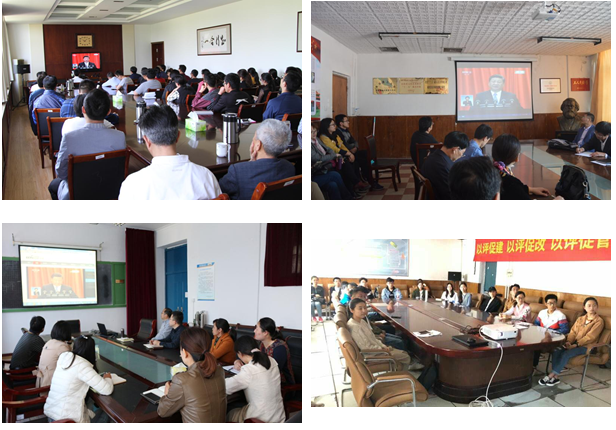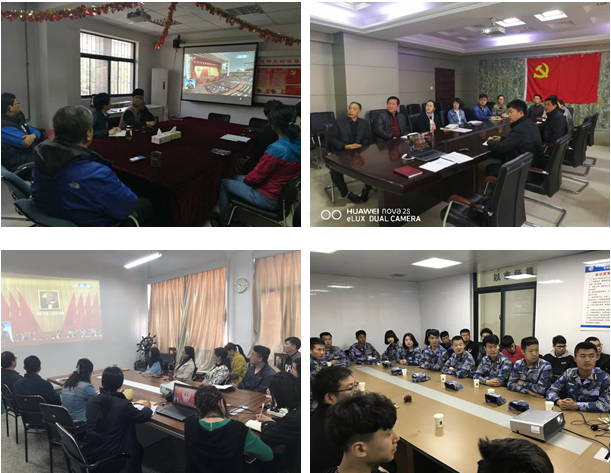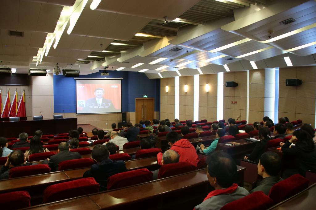 校党委理论学习中心组成员在图书科技楼1908会议室,党群部门工作人员、辅导员、班主任和学生代表在学术报告厅、教学楼报告厅、科学会堂、食堂,各党总支、分党委组织教师在会议室、教室和实验室,学生处、保卫处组织退伍学生和创业团队负责人,分别通过广播、电视、网络等多种方式和途径,实时收看收听大会实况。