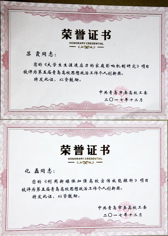 近日,青岛市委高校工委颁发了第五届青岛高校思想政治工作创新奖奖项。伟德官网党委宣传部申报的《校史文化的思想政治教育价值研究——以伟德国际1946bv官网为例》获青岛高校思想政治工作集体创新奖;苏霞申报的《大学生生涯适应力的家庭影响机制研究》、化磊申报的《利用新媒体加强高校宣传效能探析》获青岛高校思想政治工作个人创新奖。