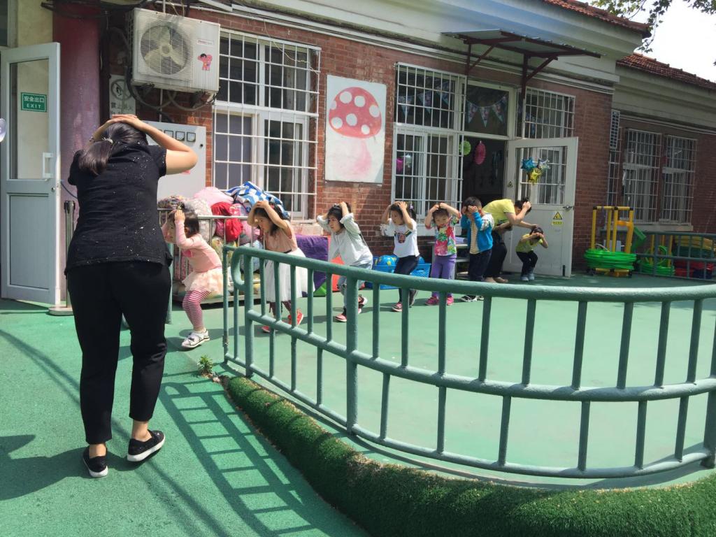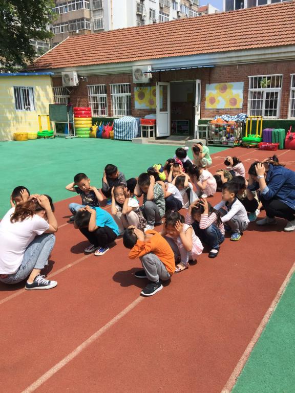 各班教师迅速按紧急疏散线路组织幼儿用手保护头部,从教室门口迅速有序撤离,集中到了操场的指定安全区域内。班主任老师及时清点幼儿人数,确认幼儿有无伤情后,并向总指挥报告。整个疏散活动安全有序,用时2分多钟。