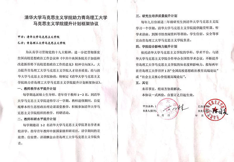 赴清华调研、与清华马院签署框架协议,是马克思主义学院践行“四新”学院理念,实行对标管理,借势发展的一项重要举措,得到了校党委书记王亚军、副书记张殿恒的指导与支持。马克思主义学院将借此东风,在学科建设、师资队伍建设、研究生培养等方面加速发展,为学校发展和山东省“新旧动能转换”贡献力量。(供稿:马克思主义学院 审核:王菁华)