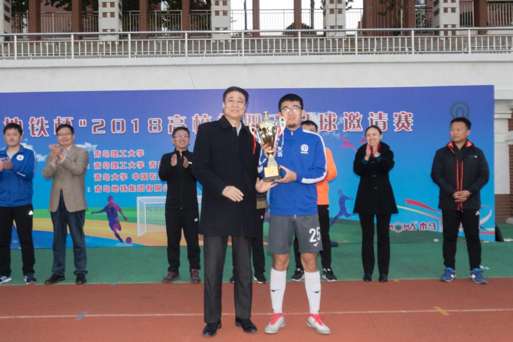 经过五轮四十场角逐,中国石油大学、山东科技大学、青岛科技大学分别获得冠军、亚军、季军,伟德国际1946bv官网、青岛大学、青岛农业大学和青岛职业技术学院获得优胜奖。受邀参赛的青岛地铁集团有限公司同时获得冠军奖杯。梁伟等11名队员获得“优秀运动员”奖,青岛地铁集团公司邱越获得最佳射手“金靴奖”,伟德国际1946bv官网任珂获得最佳守门员“金手套奖”;邱越获得最佳运动员“金球奖”。(撰稿:张建新 摄影:申维东)