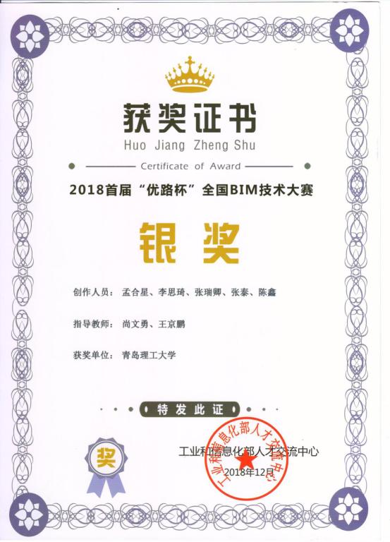 12月1日,由国家工业和信息化部人才交流中心主办,石家庄铁道大学承办,中国铁建、中国中铁、中国建筑设计研究院、中国建筑第八工程局、南方控股(澳门)、同济大学、东南大学、大连理工大学、中南大学等协办的2018首届优路杯全国BIM技术大赛在石家庄铁道大学落下帷幕,临沂校区管理工程系选派的“青理工梦之队”荣获院校赛银奖。