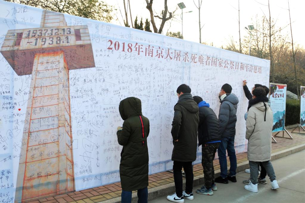 12月11日上午,校区开展公祭日海报展和宣传片展播活动,师生们纷纷驻足观看,深入了解昨日之国殇。12月13日早晨7:27,校区1213名师生代表在办公楼喷泉广场举行升旗仪式,表达对南京大屠杀死难同胞的沉痛悼念。升旗仪式后,广大师生纷纷来到篮球场甬道竖立的和平许愿墙前,留文寄哀思,签名抒情怀。