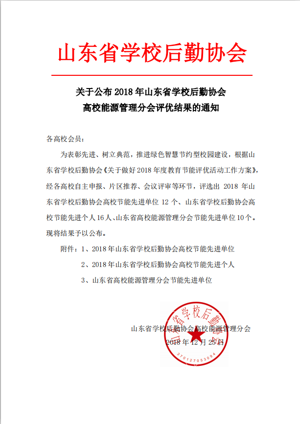 近日,伟德官网被山东省学校后勤协会评为“2018年高校节能先进单位”,修建动力中心副主任(黄岛)张显同志被评为“2018年高校节能先进个人”。