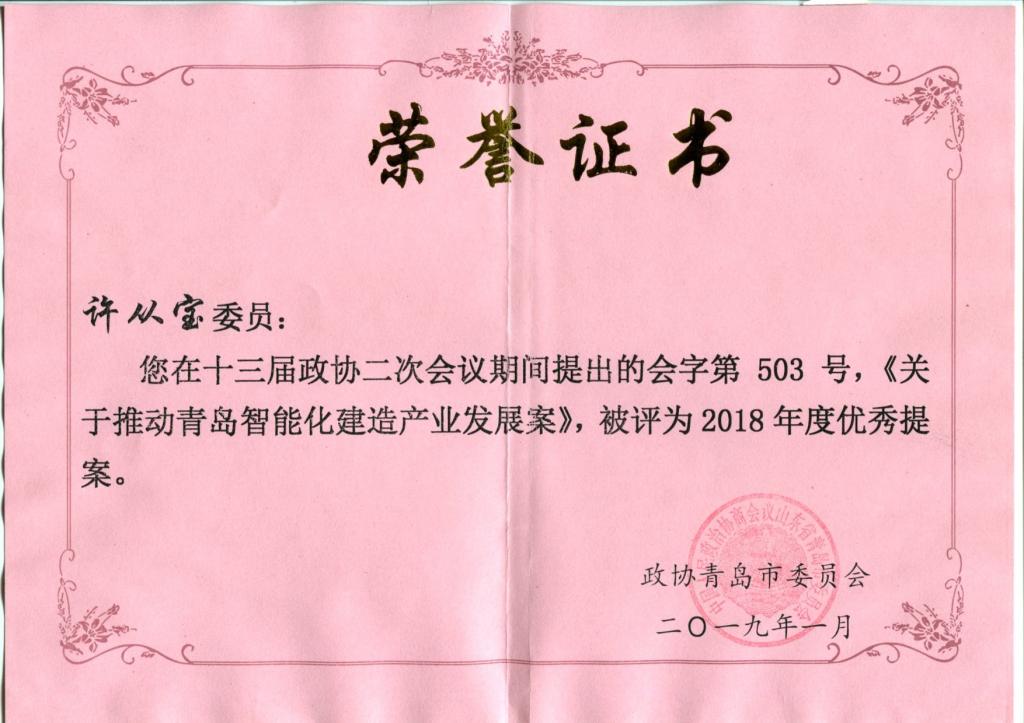 近日,政协青岛市委员会对政协青岛市十三届二次会议的优秀提案进行了表彰,伟德官网青岛市政协委员、建筑与城乡规划学院院长许从宝提交的 《关于推动青岛智能化建造产业发展案》(市政协十三届二次会议会字第503号)获得优秀提案奖。