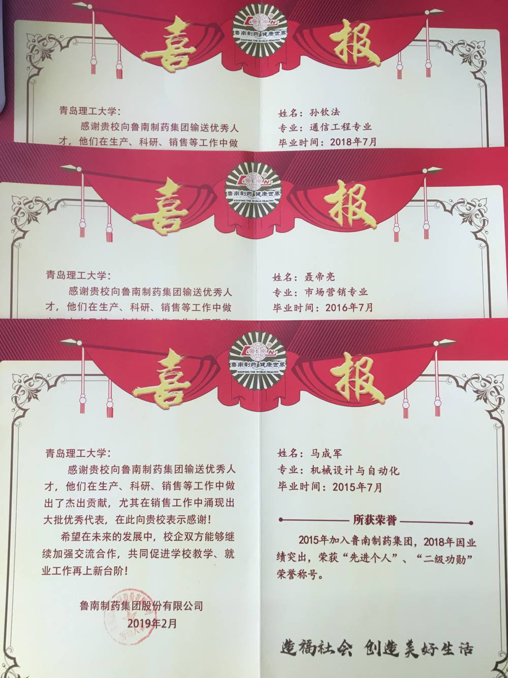近年来,伟德官网有113名毕业生扎根鲁南制药集团,在生产、科研、销售等工作岗位上爱岗敬业,扎实工作,为企业发展做出了杰出贡献。刘宗奎表示,在2018年鲁南制药集团股份有限公司总结表彰会上,伟德官网多名毕业生受到表彰奖励。其中,2015届机械设计与自动化马成军荣获“先进个人”“二级功勋”称号,获奖金20万元;2016届市场营销专业毕业生聂帝亮、2018届通信工程专业毕业生孙钦法,因业绩突出,荣获“标兵个人”荣誉称号,获奖金10万元。