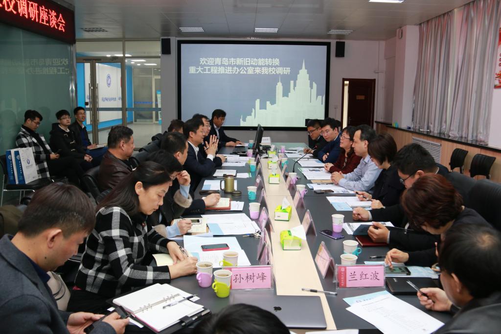 3月18日青岛市发展改革委动能办产业发展处处长鲍梅、动能推进处处长颜丙峰一行五人来校调研座谈。副校长于德湖出席并主持座谈会,发展规划处、 科技发展集团、城乡研究院、科技处、人事处、合作发展处及各学院相关科研团队负责人参加。