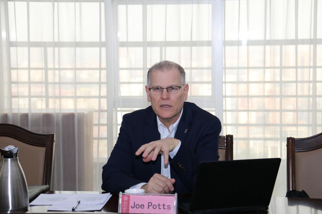 于德湖对周·波茨教授的来访表示欢迎,简要介绍了学校的发展历史、学科特色、校区建设、国际交流合作现状及学校的未来规划等。于德湖表示,感谢周·波茨教授多年来对双方合作提供的帮助与支持,希望两校在良好的合作基础上,进一步拓宽交流渠道,全方位加强交流与合作。