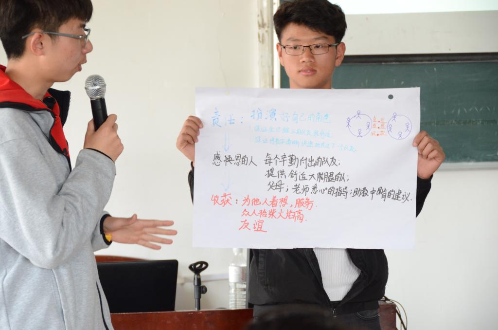两天的课程,以集体活动为载体,以思想引导为目标,采用体验式、互动式、启发式教学,激发学生对“求知”的兴趣,通过在“做”中学,在“玩”中学,在“项目实操”中让学生收获人生体验和感悟,通过精心设计的每一个项目,让学生在项目中去体会、感悟、反思和总结。围绕“感恩与责任”主题,课程设计了“领袖的风采”“无敌风火轮”“驿站传书”“人海沉浮”“我的五样”“生命之花”“行动计划”等多个项目。在“领袖的风采”项目中,学员分成2组,在不违反规则的情况下,报数又准又快的团队获胜,另一支队伍判输,队长要面临残酷的惩罚,且每一轮的惩罚翻倍,队员不能代替队长接受惩罚。在这个过程中,讲师引导学生:在你的生命中,谁承担了队长的角色?谁在为你负重前行?谁在为你犯下的错误去承担和负责?而我们又为他们做过什么,是心怀感恩,还是理所当然。是努力成长回馈反哺,还是事不关己漠不关心?在“我的五样”项目中,讲师让所有学生写下自己生命中最重要的五样事情,然后一件一件划掉,在划掉的过程中去感受失去,珍惜当下。