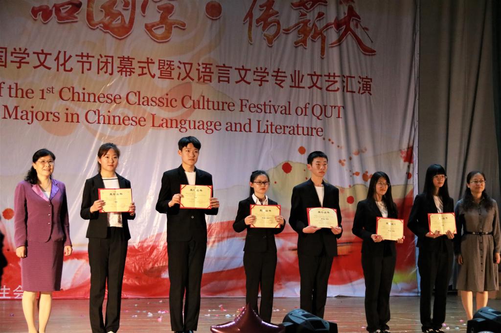 本届国学文化节共分国学之技、国学之声和国学大讲堂三大板块,共开展校级活动5场、院级活动6场,活动范围涵盖黄岛两校区,共计1691名学生参与,可谓是一场文化盛宴。本次国学文化节共有14人获得一等奖,24人获得二等奖、25人获得三等奖,43人获得优秀奖,2人获得优秀导师奖,晚会间隙,王新、巩湘红、郭印、莫玉梅分别为获奖学生颁奖。