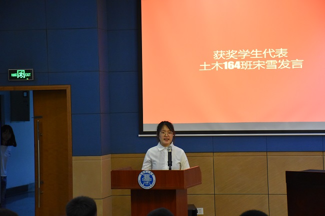 获奖学生代表土木164班宋雪发言,她代表全体获奖同学对陈国平先生和学校、学院的关心培养表示由衷的感谢和美好的祝愿,表示将会心怀感恩,继续努力学习,早日成才,报效祖国,回报母校。