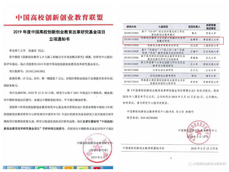 近日,中国高校创新创业教育研究中心公布2019年中国高校创新创业教育改革研究基金项目立项通知,伟德官网机械与汽车工程学院辅导员张建军申报的课题《创新创业教育2.0与新工科融合分享再造模式研究》,顺利入围中国高校创新创业教育改革研究基金项目,资助金额10万元,本基金项目每年仅立项10项。