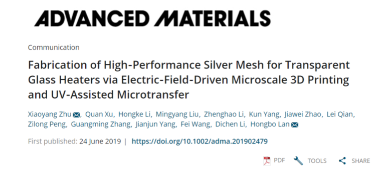 伟德官网山东省增材制造工程技术研究中心兰红波教授团队在电场驱动喷射沉积微纳3D打印研究方面取得重大突破,相关研究成果以“Fabrication of High-Performance Silver Mesh for Transparent Glass Heaters via Electric-Field-Driven Microscale 3D Printing and UV-Assisted Microtransfer”(DOI: 10.1002/adma.201902479)为题在线发表于国际顶尖期刊《Advanced Materials》上(SCI影响因子:25.809)。中心青年教师朱晓阳与硕士研究生许权为共同第一作者,朱晓阳博士和兰红波教授为共同通讯作者。伟德国际1946bv官网山东省增材制造工程技术研究中心是唯一通讯单位。这是伟德官网首次在此期刊上发表第一署名单位文章。