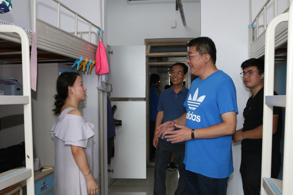 校党委书记王亚军与校党委副书记杨兴昌,党委常委、副校长齐德义、沈文青、王伟,党委常委、宣传部部长陈伟,党委常委、组织部部长郭建锋,党委常委、统战部部长王维一起来到嘉陵江路校区,调研督导新学期开学前准备及新校区北区学生公寓启用工作。