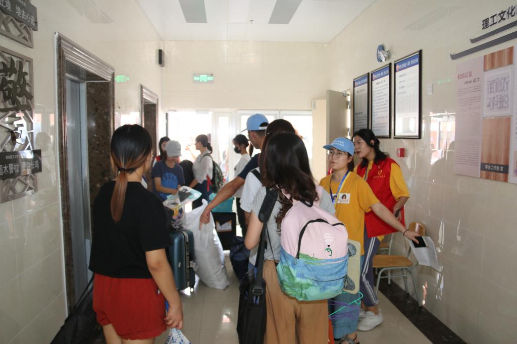 除了团委组织的志愿者工作站外,作为管理工程学院106名搬迁志愿者的一员,贾笑儒在早晨6点就已就位,在老师们的带领下投入志愿工作。这支学院的志愿者队伍包括车辆组,综合组和7个小分队,分别负责车辆联络、安全、楼内调度、行李引导、搬运等工作。“我们队的任务是帮助同学们搬运行李。放假前和暑假中,学院就组织我们进行了好几次培训,还专门制作了带有学院标识的防暑凉帽和工作证。”暑热未消,贾笑儒和同学们都已大汗淋漓,但他们一脸笑意地表示,能够为公寓搬迁工作献一份力量,感觉非常开心。
