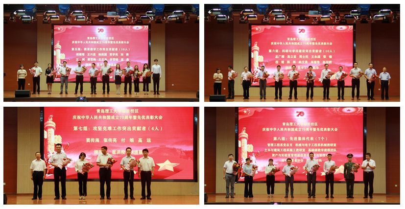 学校党委副书记、校区党委书记李国华向先进集体代表颁授证书和鲜花;李国涛向党建与思想引领工作先优代表颁授证书和鲜花;范学工、临沂校区学生会主席李岳震向教育教学工作突出贡献者颁授证书和鲜花;范学工、合作发展办公室主任王跃华向科研与学科建设突出贡献者颁授证书和鲜花;临沂校区管理办公室常务副主任崔洪俊、临沂校区管理委员会副主任刘清晨向攻坚克难工作突出贡献者颁授证书和鲜花;刘清晨与学生代表郝永恒向优秀社会服务人员代表颁授证书和鲜花;优秀在校学生代表的学业导师、班主任为他们颁授证书和鲜花。