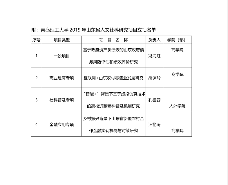 2019年山东省人文社科研究项目评审工作已经结束,伟德官网共获得立项项目4项,其中一般项目1项、商业经济专项1项、社科普及专项1项、金融应用专项专项项目1项。