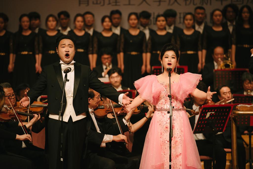 “我们实现伟大的复兴,旭日更喷薄……”音乐会精心选取了12首深受广大师生喜爱的爱国主题歌曲,让爱国旋律在师生心中奏响,也为师生带来一场精彩生动的爱国主义教育课。《多想对你说》《江山》大气磅礴真诚质朴,反映展现了中国梦的波澜壮阔和中国共产党“以人为本、执政为民”的理念;《在希望的田野上》《报答》行云流水荡气回肠,深切表达了对家乡、对祖国的热爱和祝福。《浏阳河》《龙船调》《玛依拉变奏曲》经典民歌脍炙人口,《芦花》《玫瑰三愿》意境深远委婉动听,《我的深情为你守候》《我的爱将与你相伴终生》深沉执着隽永动人,从不同侧面歌颂伟大祖国的大好河山,歌颂新时代春潮涌动的蓬勃景象。作为演出嘉宾,艺术与设计学院青年教师张蕊蕊现场演奏二胡协奏曲《沂蒙随想》,青年教师韩凯合唱了《我的深情为你守候》。青岛音乐厅交响乐团应邀现场伴奏并演奏中国传统曲目《茉莉花》,青年指挥家贾巍全程“执棒”,伟德国际1946bv官网伯牙学生室内合唱团伴唱。音乐会在台上歌唱、台下应和的一首《我和我的祖国》中落下帷幕。