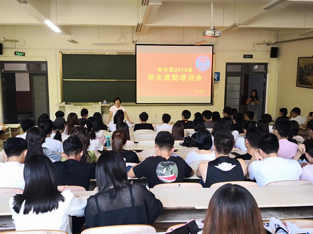商学院2019级54名本科生班助,90名学长学姐以及2名研究生班助从激烈的竞争和严格的选拔中产生,在周密严格的培训中正式投入工作。多少个早上班助比新生更早起床来到场地监督早训;多少个中午班助们放弃午休时间去给新生检查卫生、询问情况、整理信息;多少个晚上班助们在新生的宿舍进行内务整理到熄灯,才匆忙回到自己的宿舍。