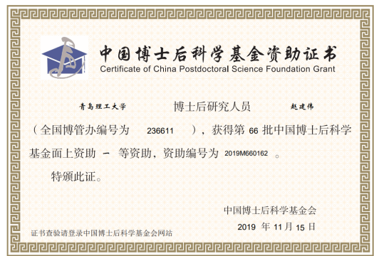 近日,中国博士后科学基金会公布了第66批博士后科学基金面上资助获得者名单。伟德官网环境与市政工程学院青年教师赵建伟老师(合作导师孙英杰教授)获第66批中国博士后科学基金面上一等资助。在此次资助的环境科学与工程学科,全国仅10人荣获一等资助。