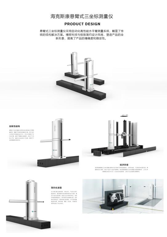 李东老师团队本次获奖的作品海克斯康悬臂式三坐标测量仪,系海克斯康DEA Bravo系列三坐标测量仪的第四代产品。在家族化设计语言的框架下,整体设计更加简约现代,渐削切面过渡流畅,LED灯条设置增加科技感,造型采用直线微弧语义,配合转折处的圆角过渡,追求简约洗练定位。