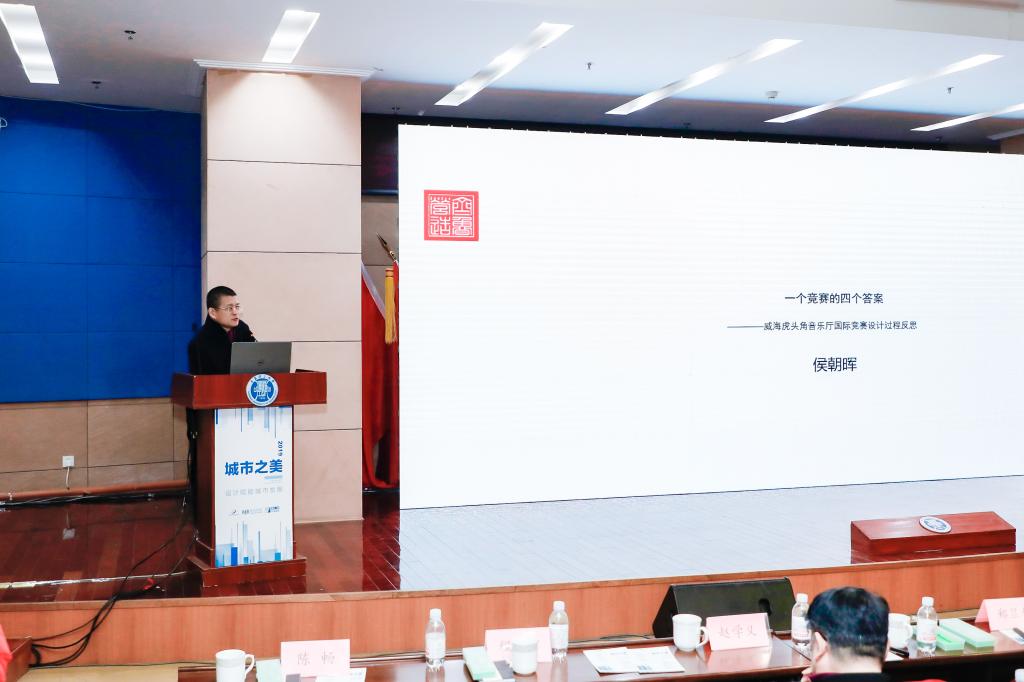 侯朝晖总建筑师做了题为《一个竞赛的四个答案——威海虎头角音乐厅国际竞赛设计过程反思》的主题讲座,对自己参加设计大赛的一些问题进行了反思并做出了总结。侯朝晖表示做建筑设计不能只注重建筑的外观是否华丽,还要考虑其实用价值以及与周边环境建筑的融合呼应,并对自己参赛的四个作品一一进行了分析并总结了经验。最后的交流环节,侯朝晖就建筑与环境的关系的问题进行了探讨,再一次强调了建筑与周围环境呼应的重要性。