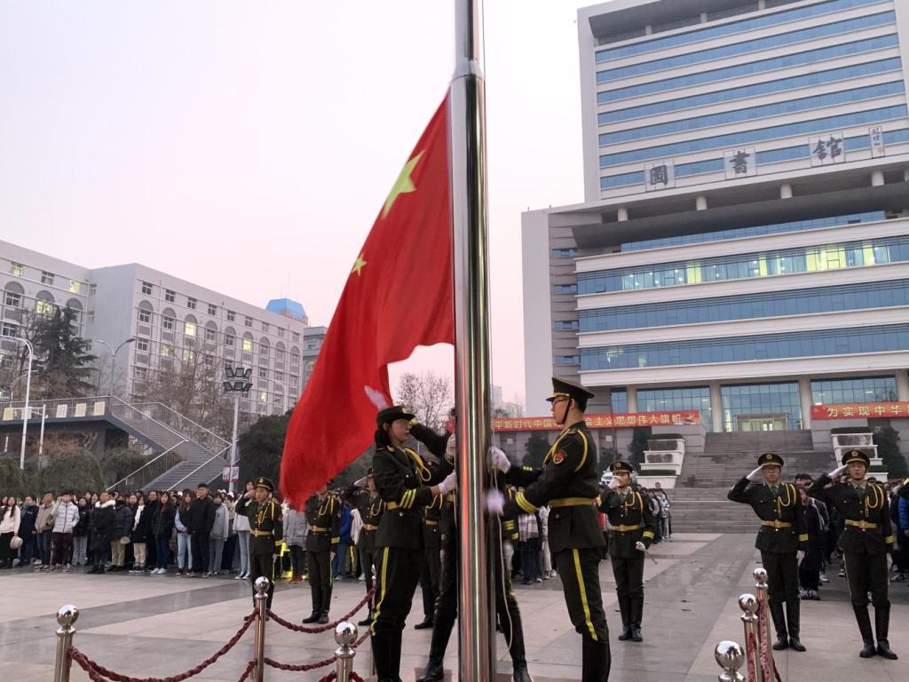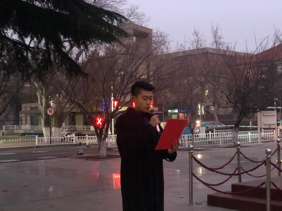 本次升旗仪式以纪念“一二·九”为主题。6:30分国旗护卫队方阵迈着整齐划一、铿锵有力的步伐,昂首阔步护卫着国旗走上升旗台。他们坚定的站在升旗台上,用全身的力量将五星红旗抛向天空。鲜艳的五星红旗在第一缕晨曦的映照下,在全体师生的注目礼中冉冉升起,神圣、庄严的氛围感染着在场的每一个人,一颗颗赤诚的心守望着那面红色旗帜,坚定而又执着,心中饱含着对祖国无尽的爱。