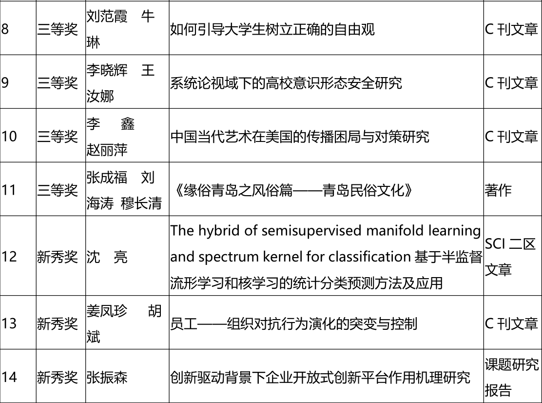 日前,青岛市第三十三次社会科学优秀成果奖评审工作已经结束,今年共409项成果申报,其中著作108部、文章230篇、结项课题研究报告55项。经专家评审,共166项获奖,其中一等奖16项、二等奖40项、三等奖85项,新秀奖25项。伟德官网14项社科成果获奖,其中二等奖2项,三等奖9项,新秀奖3项。伟德官网本次获奖的成果包括高水平著作4部、SCI收录和CSSCI期刊文章4篇和结项课题报告3篇。在这些科研成果中,基础研究和应用对策研究显著加强,传统学科和新兴学科共同发展,有价值、有深度、有影响的优秀成果不断涌现,反映出伟德官网哲学社会科学事业稳步发展的良好态势。(科技处 撰稿:周红燕 审核:李长河)