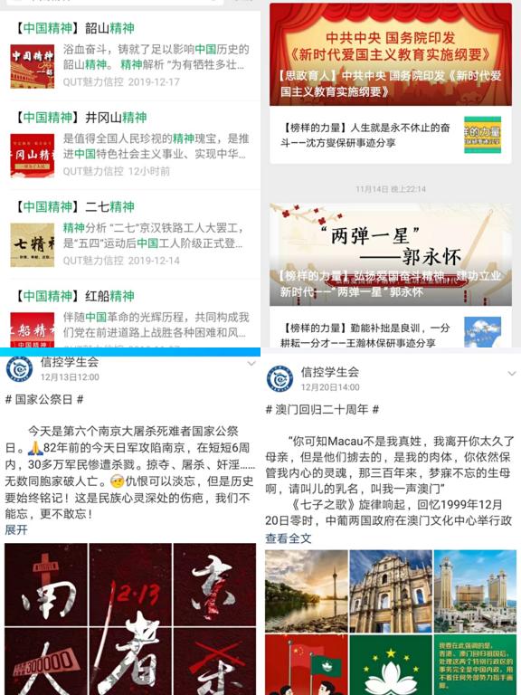 在主题教育中,学院充分利用新媒体,线上线下相结合,使主题教育宣传全覆盖,打通思政育人最后一公里。学院网站设置“不忘初心、牢记使命”专栏、“QUT魅力信控”微信公众号发布宣传主题教育内容、学院主题教育动态等,及时推送学习榜样和学习体会,引发广大学生对主题教育相关内容的关注和热评。