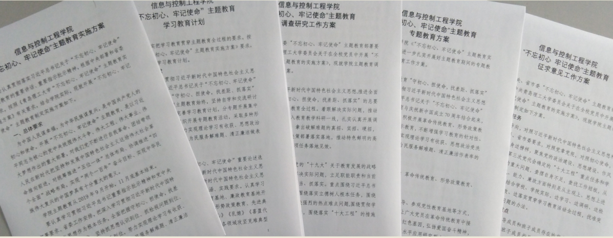 主题教育开展以来,学院认真学习领会《伟德国际1946bv官网“不忘初心、牢记使命”主题教育实施方案》,全面把握主题教育的总要求,聚焦初心使命,以高度的政治自觉、思想自觉以及行动自觉,扎扎实实部署好、开展好、落实好“不忘初心、牢记使命”主题教育。结合学院实际,第一时间成立主题教育领导小组,制定了《信息与控制工程学院“不忘初心、牢记使命”主题教育实施方案》、《信息与控制工程学院“不忘初心、牢记使命”主题教育学习教育计划》、《信息与控制工程学院“不忘初心、牢记使命”主题教育调查研究工作方案》、《信息与控制工程学院“不忘初心、牢记使命”主题教育专题教育方案》、《信息与控制工程学院“不忘初心 、牢记使命”主题教育征求意见工作方案》等文件。