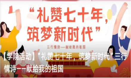 围绕建国70周年,开展“我为祖国庆生”全国各地献祝福活动、“三行情诗——献给我的祖国”、 开展“我和我的祖国”之“我为祖国绘蓝图”、“我和我的国”之“960万平方千米,我曾来过这里”等主题活动,激发学院学生的爱国情怀,展现当代青年学生的良好精神风貌。