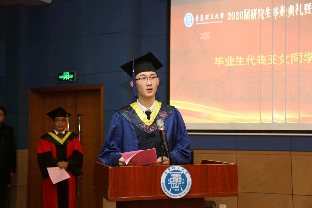 毕业生代表土木工程学院建筑与土木工程专业王文同学在发言中回顾了自己在母校的求学经历,表达了对母校及老师培养的感激之情,以及对母校事业发展壮大的喜悦之情。王文表示将带着过去这几年里塑造的优良品格、锻炼出的过硬本领、收获到的宝贵学识,踏上新的人生征程,用一生去诠释“百折不挠,刚毅厚重,勇承重载”的理工精神传统,用行动和奋斗书写无愧于新时代、无愧于青理人的华彩篇章。