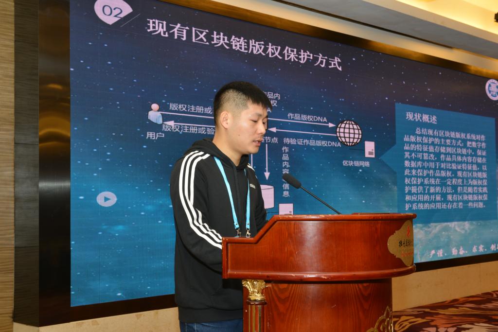 一等奖获奖团队受邀参加高峰论坛并进行方案汇报,研究生胡殿凯代表青理链团队进行了汇报,该版权保护系统方案采用区块链技术,有效地解决了数字版权保护领域中版权验证数据准确性不足、版权溯源效率低、归属问题混乱、作品创作过程保护困难等一系列难题。