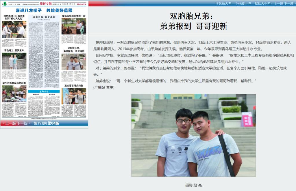 在小双公司官微上看到他的名字和照片,记者第一时间翻出了2014年9月16日出版的第353期校报迎新专版。在《双胞胎兄弟:弟弟报到、哥哥迎新》一文中,介绍的正是王小双和双胞胎哥哥王大双先后入校的故事。哥哥王大双是土木工程学院13级学生。在校期间,大双小双都曾在学校大学生记者站担任学生记者。