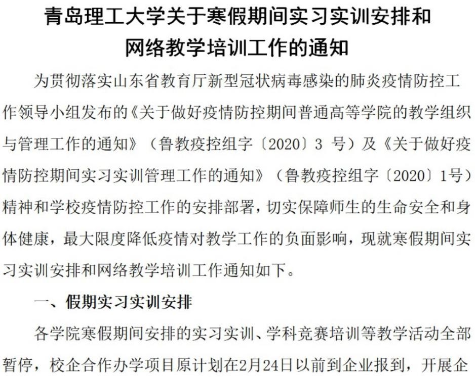 教务保障组积极落实山东省教育厅通知要求,通过教学QQ群下达紧急通知,组织学院对寒假期间安排学生参加实习实训的情况进行摸底排查,层层推动、层层实施,确保数据准确无遗漏。根据摸排结果发布了《伟德国际1946bv官网关于暂停寒假期间实习实训等安排的通知》,在通知中明确提出各学院指定专人通过电话通知、网站发布、信息群推送等多种方式与学生及实习单位建立联系,及时告知学校的决定。教务保障组坚持每天对全校3万余名学生的实习实训情况进行统计汇总,严格执行“日报告、零报告”制度。