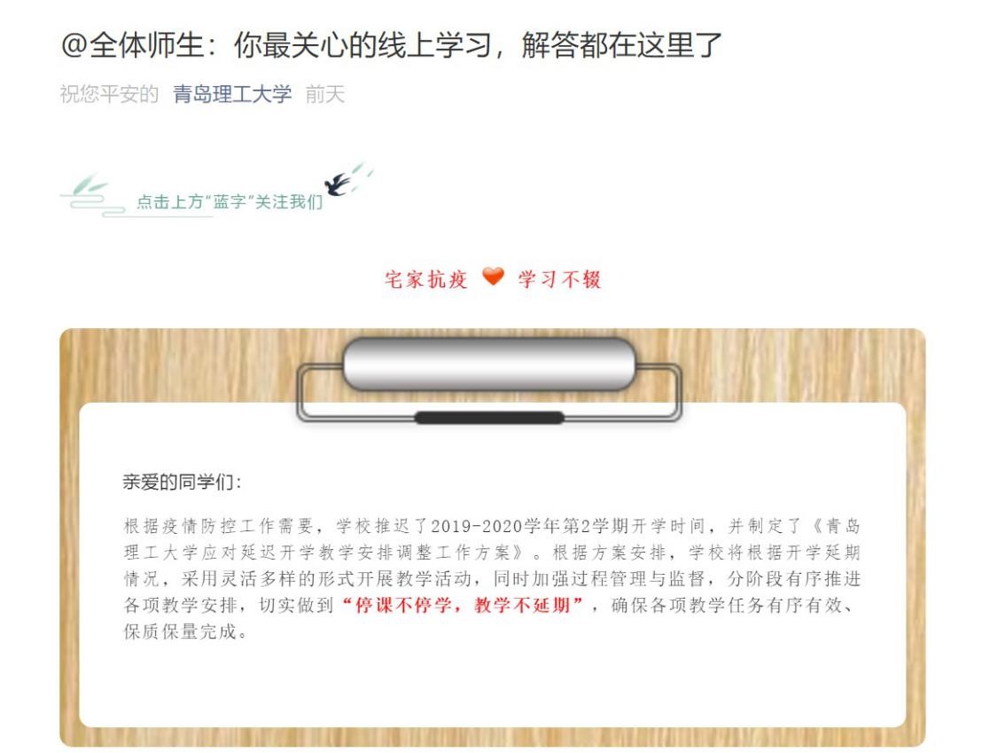 2月18日,教务保障组通过学校官方微信公众号向全体师生推送了“线上学习问答”,对课堂和实践教学如何开展、线上教学如何组织、选课补考何时进行等同学们非常关心的问题进行了解答。